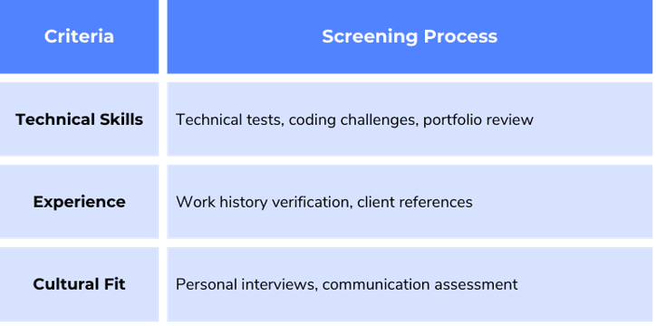 Kun yritykset tekevät yhteistyötä lahjakkuuksien tarjoajien kanssa, ne voivat välttää tuntemattomien konsulttien palkkaamiseen liittyvät riskit. Talent-palveluntarjoajilla on perusteellinen seulontaprosessi, jossa ne arvioivat konsulttien teknisen asiantuntemuksen, alan kokemuksen ja kulttuurisen sopivuuden ennen kuin ne suosittelevat heitä projekteihin.